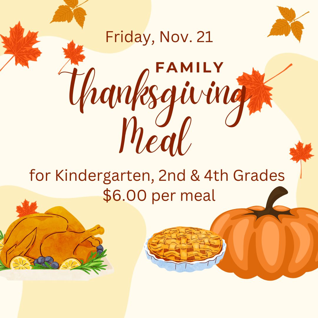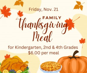 Our annual Thanksgiving meal will be on Friday, November 21st! Kindergarten, 2nd grade, and 4th grade families will be invited to eat with us on this day. Unfortunately, our cafeteria isn’t large enough to accommodate all of the grades. 1st, 3rd and 5th will be hosting the Christmas lunch in December. Make plans to join us for this delicious meal by turning in the form that was sent home last week. The cost of the meal is $6 and it will be a cash only event. We look forward to having you with us!